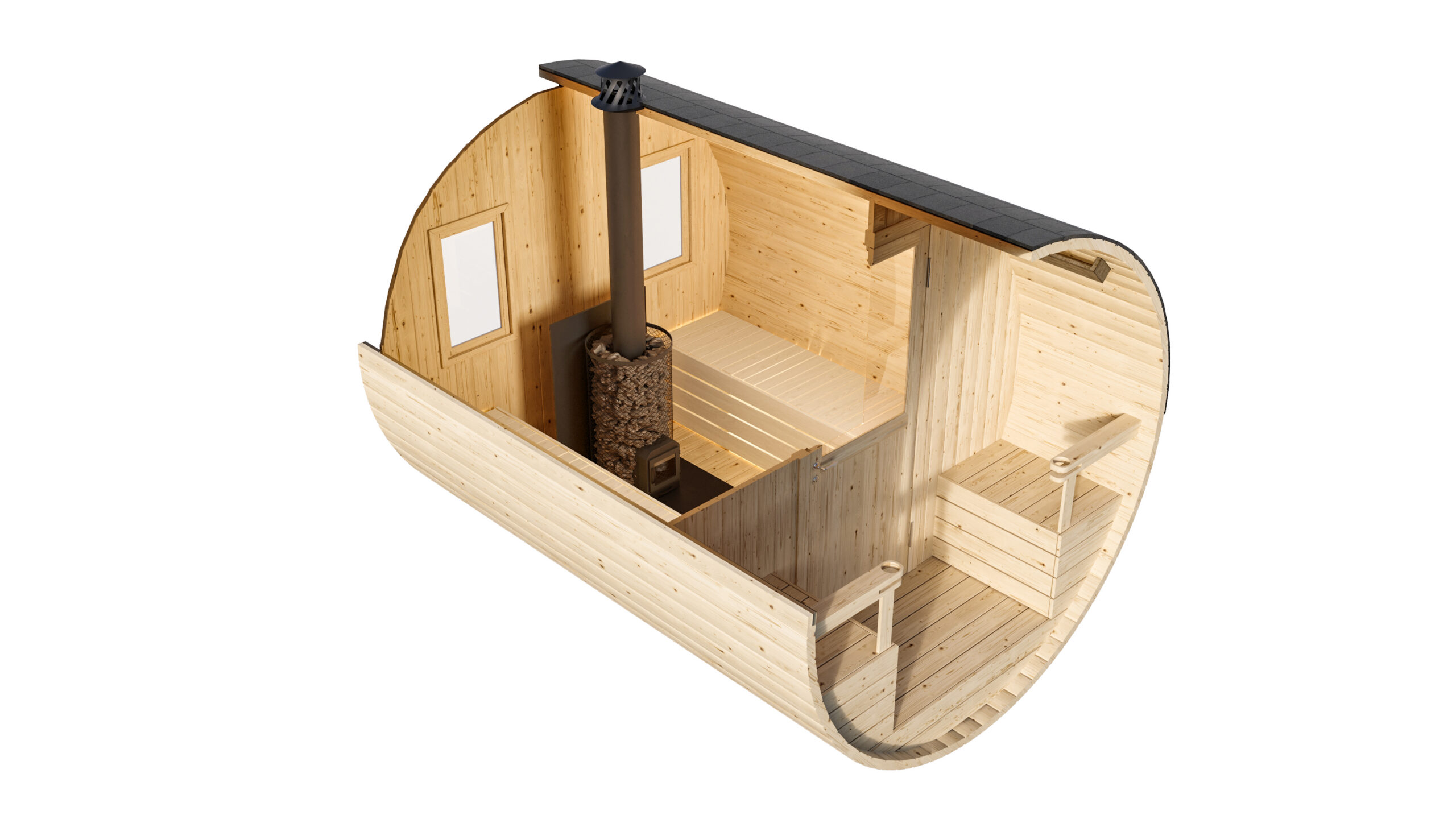 Ovaalse kujuga saunade eelis on suurem kõrgus, mis võimaldab paigaldada kaheastmelise lava ja tagab mugavama kasutuse.